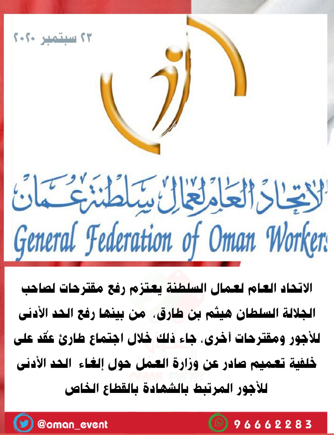 ع مان الحدث On Twitter الاتحاد العام لعمال السلطنة يعتزم رفع مقترحات لصاحب الجلالة السلطان هيثم بن طارق من بينها رفع الحد الأدنى للأجور ومقترحات أخرى Https T Co H1nyhwwk2e