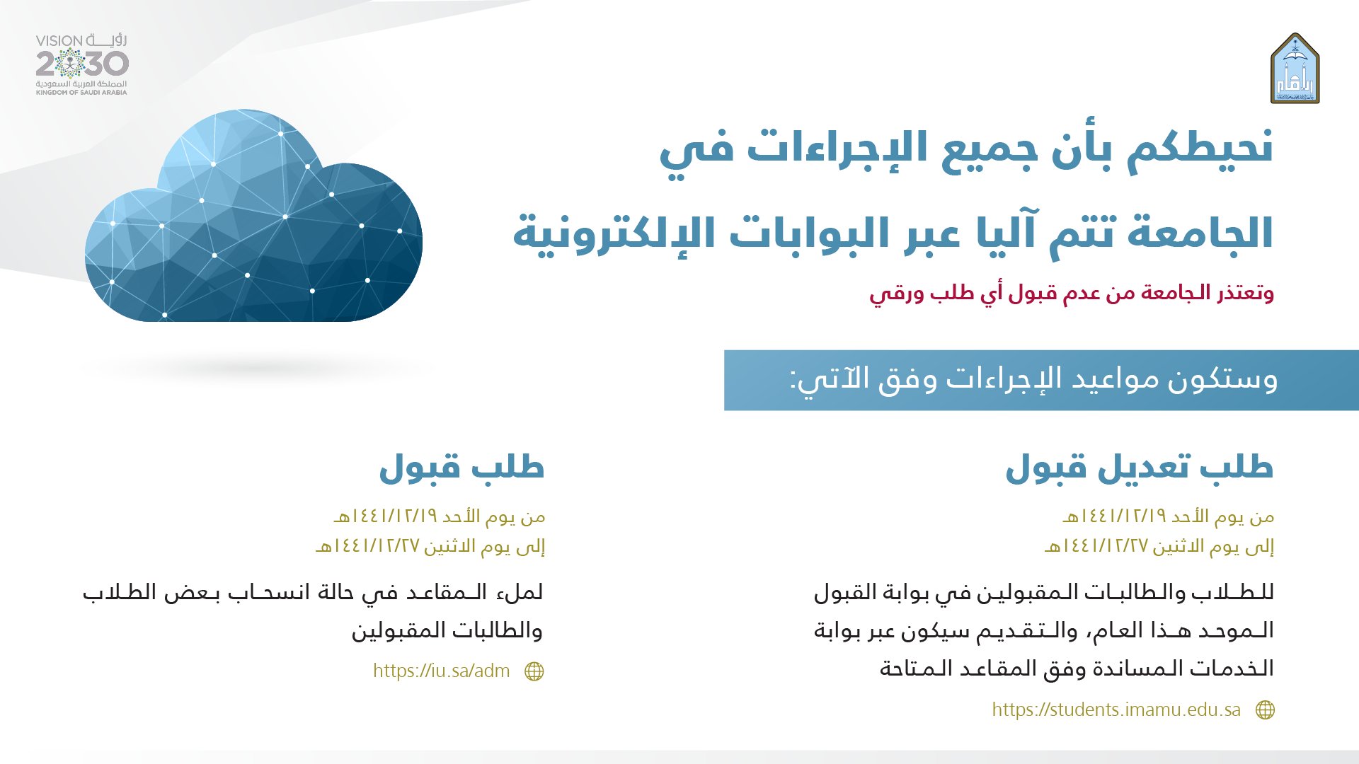 جامعة الإمام محمد بن سعود الإسلامية On Twitter عمادة القبول والتسجيل في جامعة الإمام تعلن مواعيد الإجراءات الأكاديمية عبر البوابات الإلكترونية وتؤكد أنها لن تقبل أي طلب ورقي Https T Co Ggckrhanjh