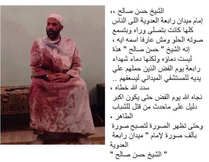 Hamed Kamel Twitterren الشيخ حسن صالح إمام مسجد رابعة العدوية شاهد حي علي مذبحة رابعة العدوية الصورة يوم 14أغسطس2013لدماء الضحايا علي ملابسه Http T Co Jmkrvcs0ii