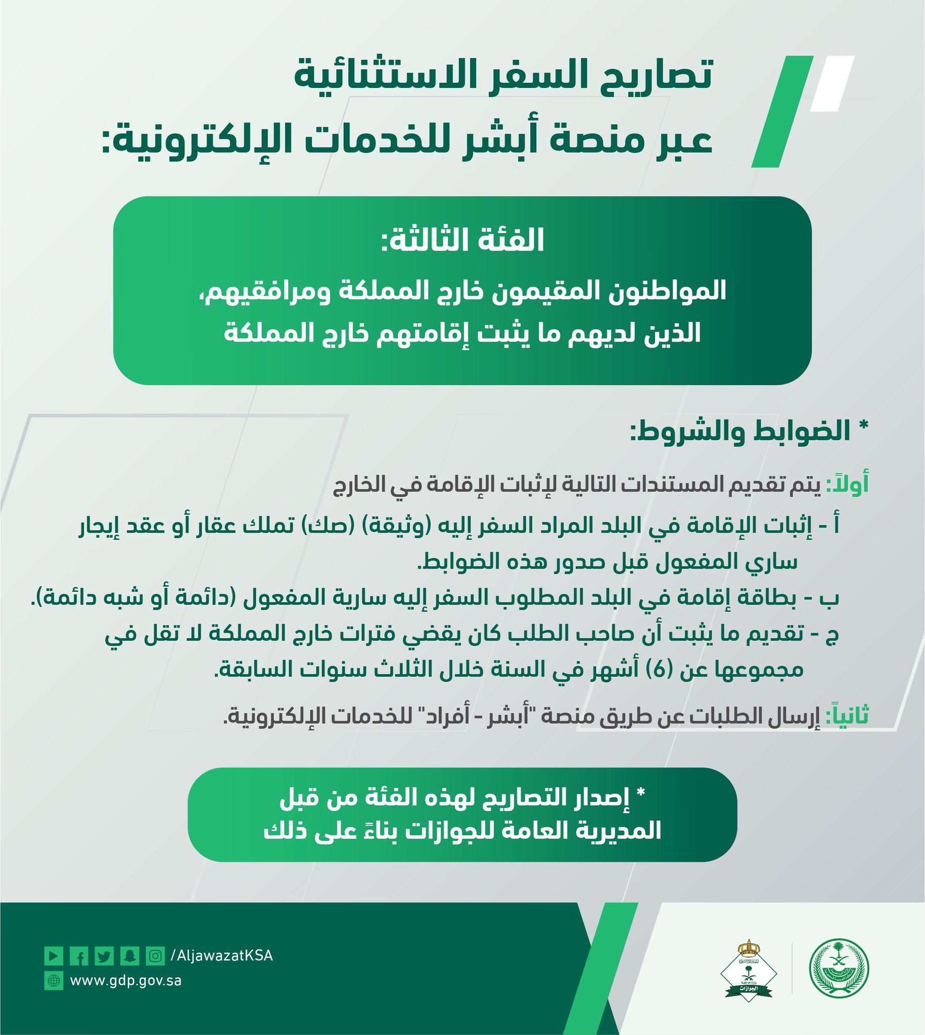 الجوازات السعودية On Twitter الضوابط والشروط المتعلقة بتصاريح السفر للفئات الاستثنائية عبر منصة أبشر للخدمات الإلكترونية وذلك للمواطنون المقيمون خارج المملكة ومرافقيهم الذين لديهم ما يثبت إقامتهم خارج المملكة Https T Co Djhtksy2uu Https